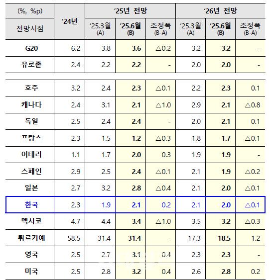 물가상승률의 경우 G20 국가는 올해 3.6%로 지난 전망보다 0.2%포인트 하향됐고, 내년은 3.2%로 전망치가 같았다.