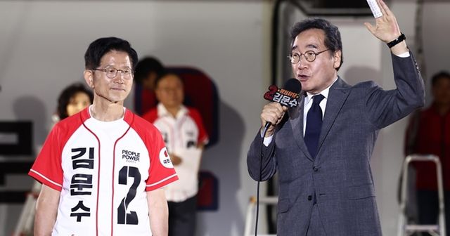 이낙연 전 국무총리가 제21대 대통령 선거를 하루 앞둔 2일 오후 서울 중구 서울시청 앞 광장에서 열린 김문수 국민의힘 대통령 후보의 '울려라 함성, 들어라 승리의 메아리' 피날레 유세에서 김 후보 지지 연설을 하고 있다. / 뉴스1