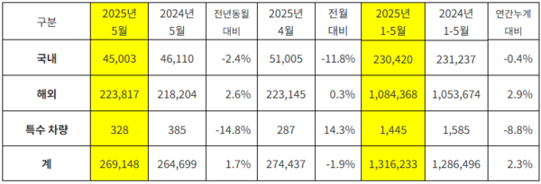 [폴리뉴스 정철우 기자] 기아는 2025년 5월 글로벌 시장에서 국내 4만 5,003대, 해외 22만 3,817대, 특수 328대 등 전년 동기 대비 1.7% 증가한 26만 9,148대를 판매했다. (도매 판매 기준)