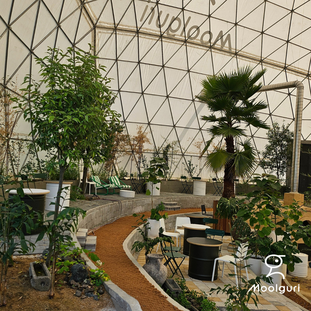 몰구리빵집의 또 다른 매력 포인트는 식물원 같은 실내 공간입니다. 다양한 식물들이 돔 형태의 실내에 배치되어 있어 온실에 들어온 듯한 포근함을 제공합니다. 밝은 자연광 아래에서 빵과 함께 편안한 분위기를 즐겨보세요.