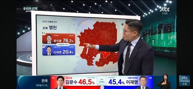 앞선 2022 대선에서는 국민의힘 윤석열 후보가 76.2%를 얻어 이재명 후보를 크게 눌렀다. 이 후보의 득표율은 20.4%였다.