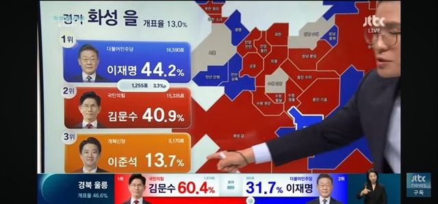 개표율 13.0%인 경기 화성 을에서는 이재명 후보가 44.2%로 앞서고 있다. 이어 김문수 후보가 40.9%다. 이준석 후보는 13.7%로 3위다.