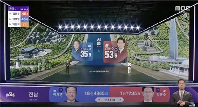 MBC는 대규모 LED와 화려한 그래픽을 앞세워 시청자의 시선을 사로잡았다. 기존의 4면 스크린에서 6면 스크린으로 확장한 공간은 입체적인 시청 경험을 제공했고, 생성형 인공지능(AI) 기술을 활용한 출구조사 카운트다운 영상도 눈에 띄었다. 이 영상은 일제강점기 독립운동 장면과 현재 한국 사회의 모습을 나란히 배치하며 역사와 현재를 연결하는 상징적인 연출을 보여줬다.