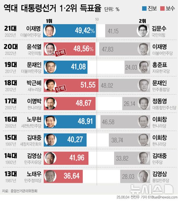뉴시스 보도에 따르면, 4일 중앙선거관리위원회에 따르면 개표가 100% 완료된 가운데 이 대통령은 1728만7513표(득표율 49.42%)를 얻어, 김문수 후보(1439만5639표, 득표율 41.15%)를 289만여 표 차이로 제치고 당선됐다. 이는 지난 대선에서 윤석열 전 대통령이 기록한 최다 득표(1639만 표)를 넘어선 수치다.
