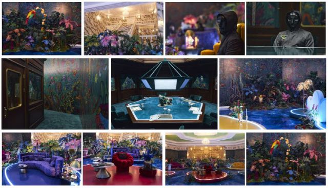 함께 공개된 VIP룸 세트 스틸은 더 화려해지고 다채로워진 스케일의 시즌3를 본격적으로 궁금하게 만든다. 먼저, 블랙 대리석을 사용했던 이전 시즌과 달리 화이트 대리석을 사용한 VIP룸은 시즌3만의 차별성을 확연히 보여준다. 채경선 미술감독은 이에 대해 “불같은 ‘기훈’(이정재)과는 달리 차갑고 냉정한 얼음 같은 ‘프론트맨’(이병헌)의 온도 차이를 화이트 대리석으로 표현해 극명한 대조를 표현했다”고 전하며 공간에 묻어나는 캐릭터의 특징에 대해 설명했다. 한편, VIP들이 식사하는 공간 역시 이목을 사로잡는다. “육각형은 굉장히 단단한 도형이고, 신탁 같은 느낌이 있어 그 의미를 표현하고 싶었다”는 채경선 미술감독의 말처럼 시즌3의 VIP룸은 은밀하고 프라이빗한 느낌이 더욱 극대화된 동시에, 참가자들이 목숨 걸고 게임을 진행하는 공간과 더욱 극명해진 대조를 선보인다. 또한, “잔인하고 폭력적인 모든 것들을 망라한 악의 존재는 독이라고 생각했다. 그래서 독초들을 표현하고 디자인할 때 컬러를 다양하게 써서 VIP룸을 구성했다”며 “시즌1에서는 초원의 느낌으로 약육강식의 세계를 드러냈다면 시즌3에서는 화려하지만 위험한 독초를 사용하여 과감한 디자인으로 공간을 만들어냈다”고 전했다.
