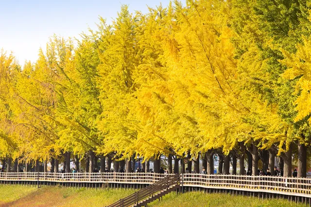 충남 아산의 곡교천 은행나무길은 오랫동안 가을의 황금빛 경관을 대표하는 명소로 유명합니다. 노랗게 변한 은행잎이 길을 덮어 그림 같은 낭만적인 풍경을 제공합니다.