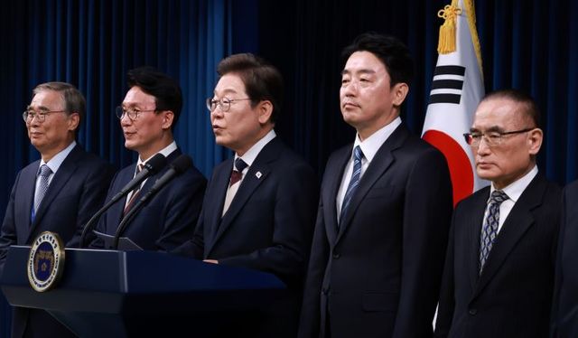 이재명 대통령이 4일 서울 용산 대통령실 청사에서 열린 새 정부 첫 인사 발표를 하고 있다. 왼쪽부터 이종석 국가정보원장 후보자, 김민석 국무총리 후보자, 이 대통령, 강훈식 대통령비서실장, 위성락 안보실장. 연합뉴스.