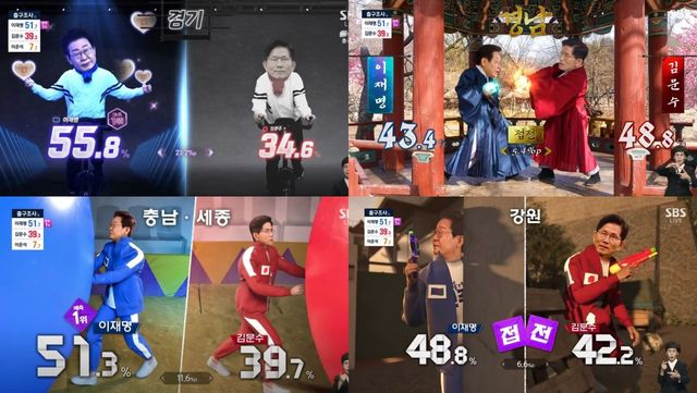 SBS는 트렌드를 접목한 그래픽으로 눈길을 끌었다. 각 후보가 스피닝을 하는 모습, 한복을 입은 겨루는 모습, 넷플릭스 드라마 '오징어게임'에 등장하는 트레이닝 복을 입고 다양한 게임을 하는 모습 등 다양한 콘셉트로 개표 방송을 진행했다. SBS 투표 마스코트인 흰 곰 '투표로'의 모습도 보인다. 투표로는 오징어게임 속 '영희'를 대신해 게임 인형 역할을 하기도 했다.