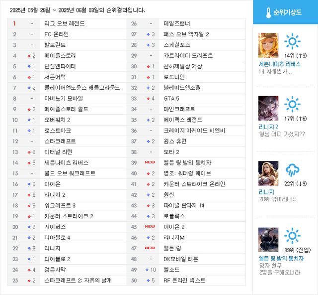 중위권에서는 검은사막이 2주 연속 상승해 24위를 차지했다. 지난 28일에 5년 간 이어온 협동형 던전 ‘아토락시온’의 마지막을 장식하는 신규 콘텐츠를 업데이트하며, 간만에 규모 있는 업데이트로 이목을 집중시킨 것으로 보인다. 여기에 5월 14일부터 주요 재화인 크론석을 대거 증정하는 6주년 이벤트도 시작하며 화력이 부쩍 높아졌다. 상승한 분위기를 6월 말에 열리는 하이델 연회까지 끌고 갈 수 있느냐가 관건이다.