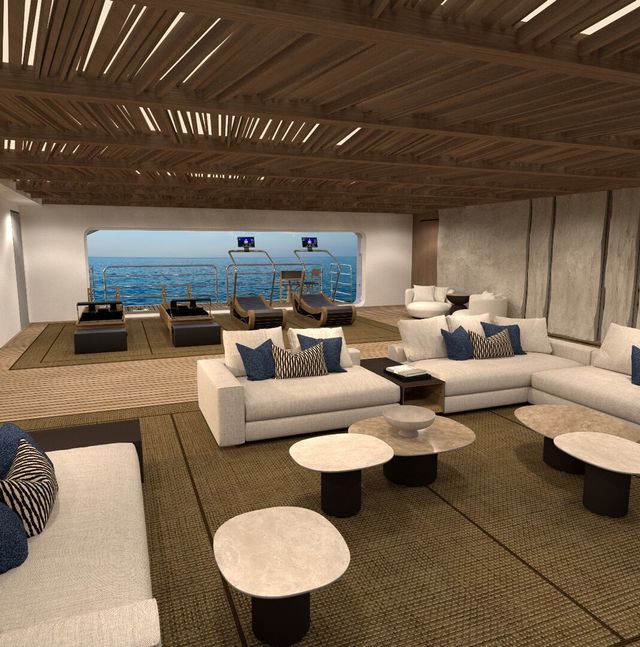 디자인의 중심은 갑판에서 유기적으로 흐르듯 이어지는 인상적인 수영장으로 해안선의 자연스러운 곡선에서 영감을 받아 설계됐다. 수영장 주변에는 텐트형 선베드와 일광욕 패드가 배치돼 햇살을 즐길 수 있는 충분한 공간을 제공한다.