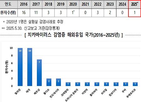 지카바이러스 감염증은 세계적으로 2023년 5만 6,601명, 2024년 4만 4,957명이 발생했으며, 올해는 5월까지 1만 2,660명이 감염됐다.