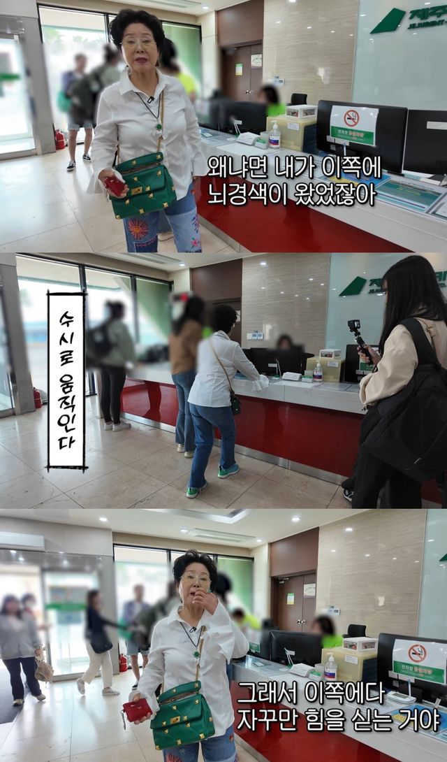 제주도에 도착한 후 렌터카센터에 방문한 선우용여. 대기 중에도 수시로 움직이는 모습이 포착됐다. 그는 “내가 예전에 뇌경색이 오지 않얐냐. 본인이 노력해야 한다. 가만히 누워 있으면 빨리 간다”라고 설명했다.