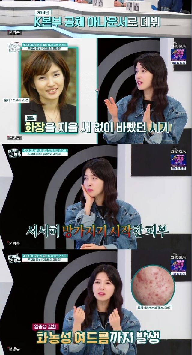 김경란은 "2001년에 KBS 공채 아나운서가 돼서 그때부터 매일 화장을 하고 뉴스만 하는 게 아니라 녹화도 하고 촬영도 하다 보니 24시간 중 20시간을 화장을 한 채로 지냈다"라고 이야기했다.