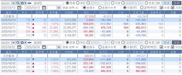 소니드 투자자 동향을 보면, 지난달 30일부터 이날(4일)까지 개인투자자는 86만 2251주를 순매수했으며, 외국인은 23만 6374주를 순매도했다. 기관은 거래하지 않았다.