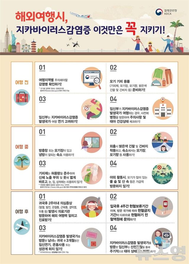 이에 동남아시아 지역 방문 시 모기에 물리지 않도록 예방수칙을 준수하고 입국 후 지카바이러스 감염증 의심증상인 발진, 발열, 결막염, 관절통, 두통 등의 확인을 당부했다.