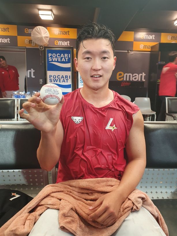 동료들의 '격한' 축하를 받은 김건우는 1군 첫 엔트리 등록, 첫 승, 첫 홀드에 이어 네 번째 '기념구'를 챙겼다고 운을 뗀 뒤 "오늘 공(기념구)이 가장 큰 의미가 있을 거 같다"며 "감독님과 코치님께서 좋은 기회를 주셔서 계속 선발로 돌고 있다. 이전 두 경기는 짧게 던져 아쉬운 점이 많았다. 오늘은 5이닝까지 던질 수 있어서 기분 좋다"라고 말했다. 이어 "저보다 더 좋은 투수, 선배님들이 많아서 (6회 투구에 대한 욕심은) 전혀 없었다. 기분이 엄청 좋긴 한데 별다른 거 없고 다음 경기 또 준비해야 한다. 기회를 주신 거에 감사하고 그런 것만 생각하고 있다"라고 힘주어 말했다.
