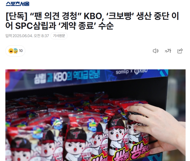 이로써 전국적으로 품귀현상을 빚었던 크보빵 생산 중단을 넘어, KBO와 SPC삼립이 협업한 제품은 더 이상 출시하지 않을 것으로 보인다.
