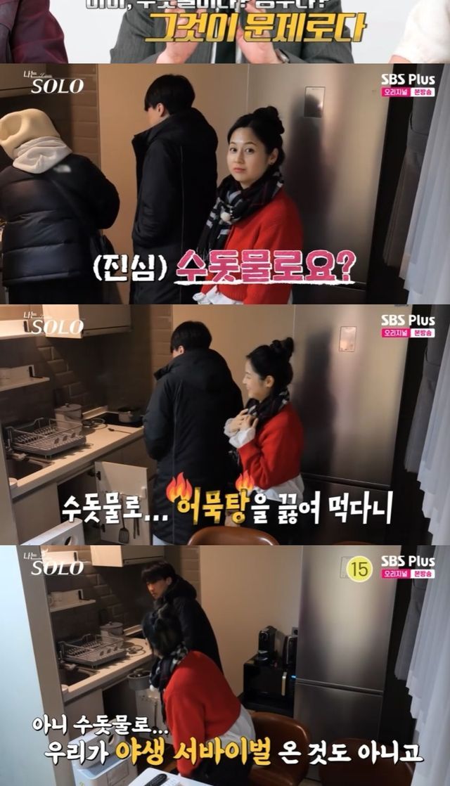 영수는 "그래도 환경공학과 교수인데 끓여서 먹으면 된다"라고 주장했다. 하지만 옥순은 제작진에게 "생수 가져와도 되냐. 우리 생수 사왔는데"라고 물었다.