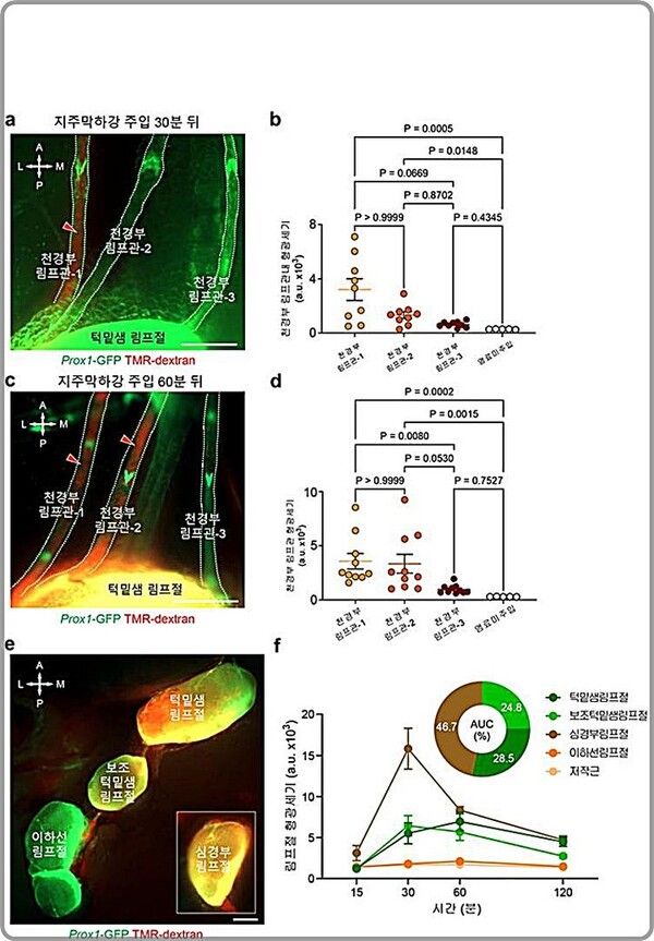 관찰 결과 뇌척수액은 눈 주위, 코안 쪽, 입천장의 림프관을 통해 얼굴 피부 아래(주로 눈·코 옆) 림프관으로 모인 뒤 턱밑샘 림프절로 배출되는 것으로 확인됐다.