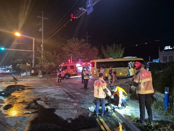 지난 4일 오후 8시42분께 충남 천안시 서북구 성거읍 오목교차로에서 출퇴근버스가 오토바이와 충돌했다.