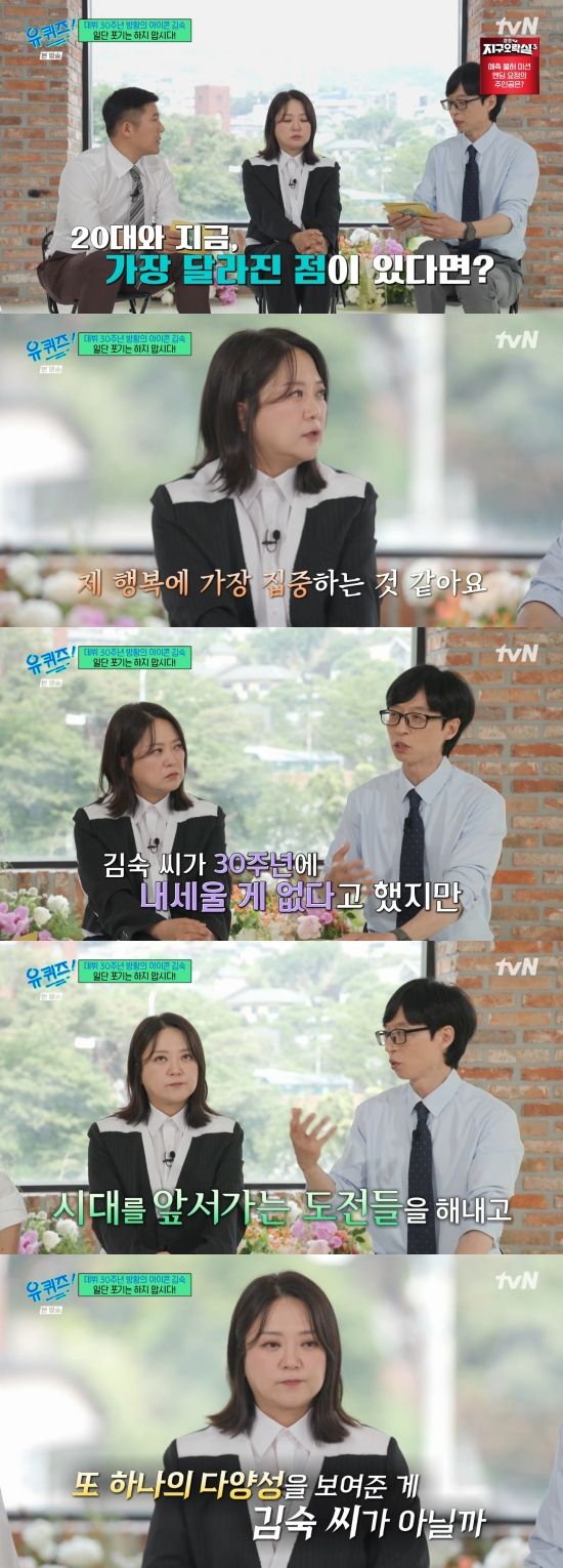 김숙은 "20대 때는 잠깐 방황하는 시절은 있었지만 정말 치열하게 살았던 거 같다. 정말 열심히 살았던 거 같다 여기 가서 상처받고 저기 가서 상처받고 이랬다면 지금은 어떤 노하우들이 생기면서 제 행복에 가장 치중하는 거 같다. 나에 대해서만 집중을 하고 싶어 한다"라며 털어놨다.