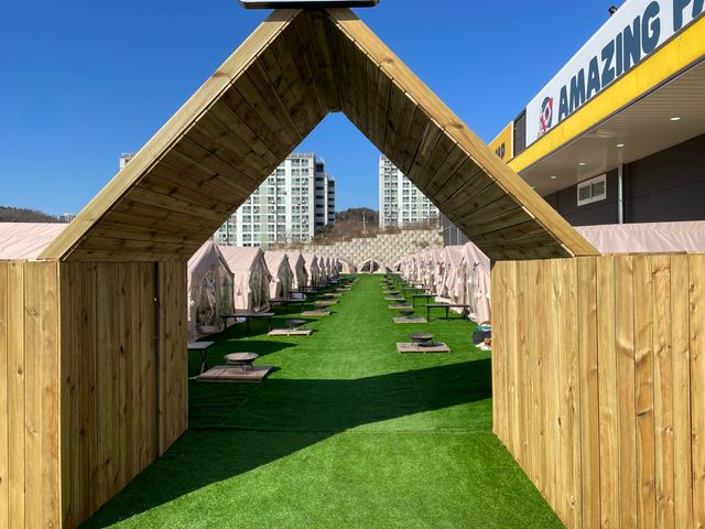 야외 텐트존은 외부 음식 반입이 가능해 인기를 끌고 있습니다. 인조잔디 위에 감성적인 투룸텐트가 설치되어 있으며, 온수 사용이 가능한 개수대 등 편리한 캠핑을 위한 시설이 준비되어 있습니다. 주말 기준 4인 입장권 포함 10만 원 선으로, 당일치기 캠핑을 즐기기에 부담 없습니다.