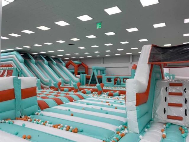 가장 큰 매력은 500평 규모의 초대형 에어바운스입니다. 에어슬라이드, 볼풀장, 다양한 장애물이 마련되어 있어 아이들에게 더할 나위 없는 놀이터가 됩니다. 바닥은 푹신하여 안전하며, 디자인도 민트 컬러로 깔끔하게 되어있어 시각적 만족도도 높습니다.
