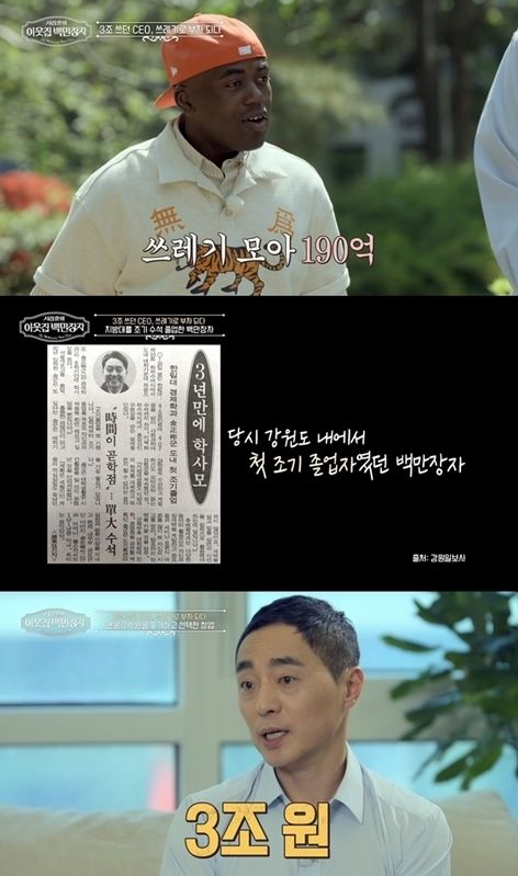 4일 방송된 EBS, E채널 공동 제작 '서장훈의 이웃집 백만장자'(이하 '이웃집 백만장자')에는 연 매출 190억 원, 기업 가치 2500억 원 규모의 재활용 기업 대표 김정빈이 출연했다.