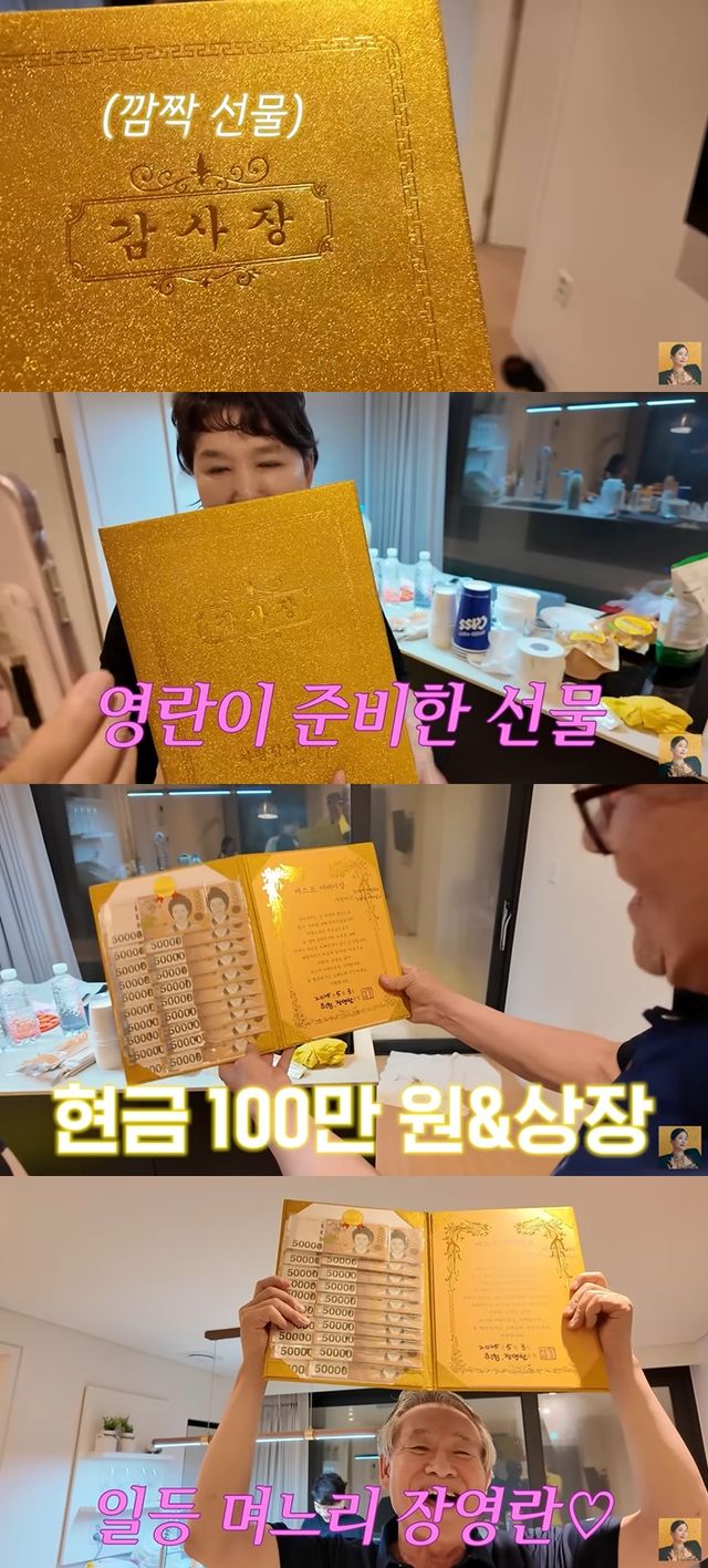 시부모를 위한 ‘베스트 어버이상’ 상장과 함께 현금 100만 원을 전달하며 감사의 마음을 전했다. 이를 받은 시아버지는 "영란이 너무 사랑한다. 행복하다. 고맙다"며 기쁨을 표했다.