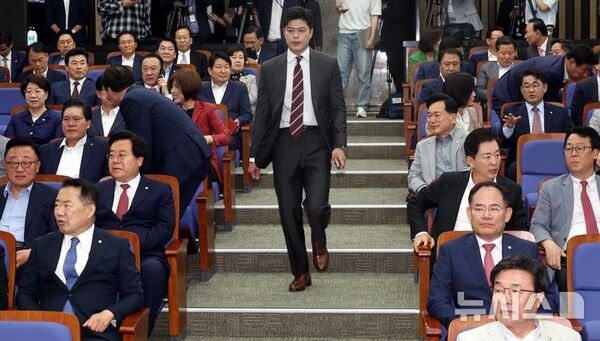 김용태 위원장은 이날 오후 의원총회 속개 전 기자들과 만나 "과거 (특검법 반대) 당론 변경 절차를 밟았는데 잘 이뤄지지 못했다"며 "저는 당론 변경 절차를 (진행해야) 한다고 손을 들었다"고 말했다.