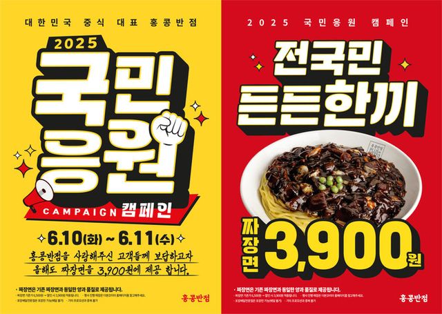 먼저 6월10일부터 11일까지는 전 국민을 대상으로 '국민응원 캠페인'을 진행한다. 일부 매장을 제외한 전국 홍콩반점 매장 방문 시 누구나 짜장면을 할인가에 즐길 수 있다. 단, 홀 영업을 하지 않는 포장·배달 전문 매장의 경우 포장 주문 시 동일한 할인 혜택이 적용된다.
