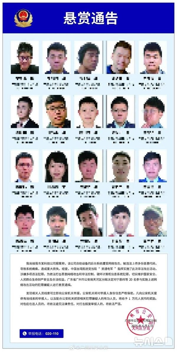 뉴시스 보도에 따르면, 보도에 따르면 중국 광저우시 공안국 톈허구 분국은 이날 불법 사이버 공격 활동 관련 범죄 혐의로 닝언웨이 등 용의자 20명을 현상수배한다고 공지했다.