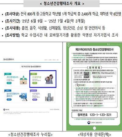 질병관리청(청장 지영미)이 오는 6월 9일부터 7월 4일까지 전국 800개 중·고등학교 재학생 약 6만 명을 대상으로 ‘제21차(2025년) 청소년건강행태조사’를 실시한다.