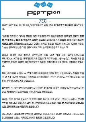 펩트론은 지난해 10월 릴리와 스마트데포 플랫폼에 대한 14개월간 기술평가 계약을 체결하고 릴리의 펩타이드 기반 약물에 자사 기술을 적용하는 공동연구에 착수했다.