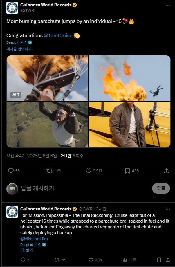 톰 크루즈가 불붙은 낙하산으로 16회 낙하한 기록으로 기네스북에 오르심