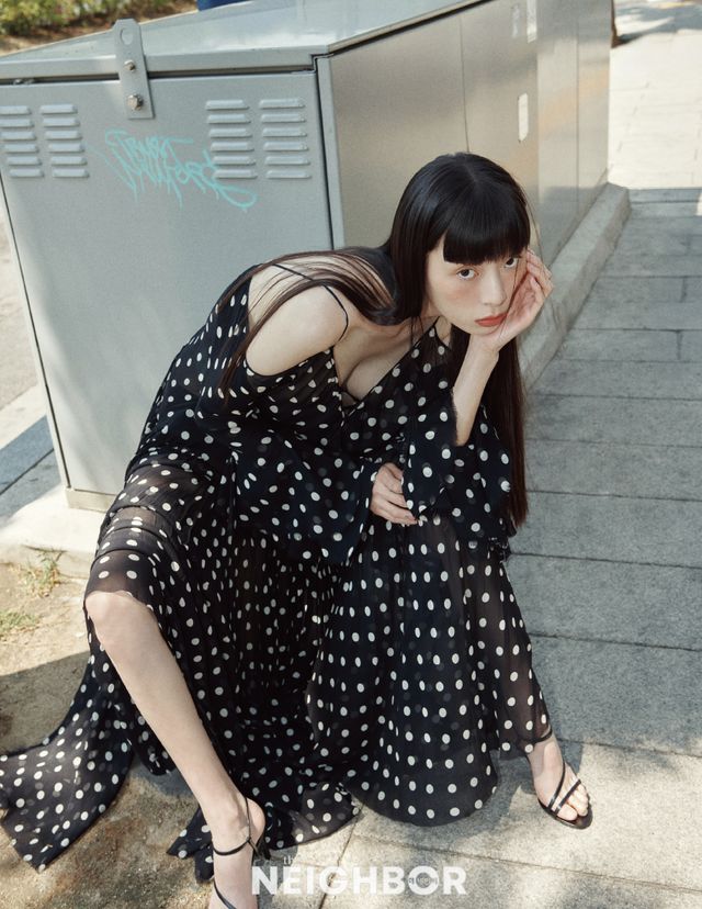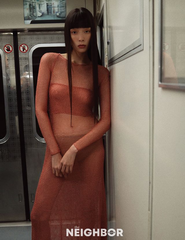 Acne Studios 컷아웃 드레스, 레이어드한 니트 톱 모두 가격 미정.
