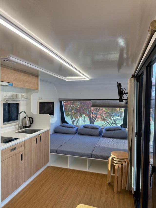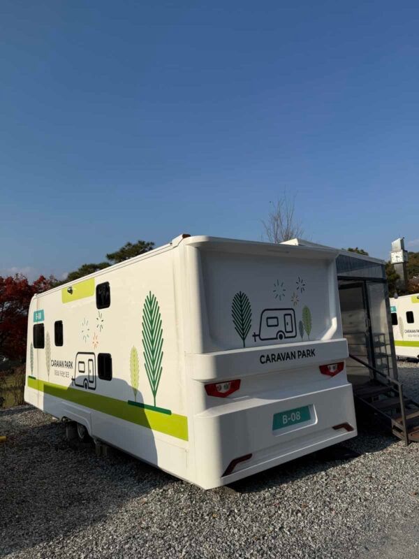 카라반의 내부는 넉넉한 공간과 깨끗함이 돋보입니다. 침구류는 깨끗하고, 주방과 화장실도 정돈되어 있어 쾌적함을 느낄 수 있습니다. 환풍 시설이 잘 되어 있어 신선한 공기를 유지할 수 있으며, 캠핑장 구역이 잘 나뉘어 있어 프라이빗한 시간을 즐기기에도 좋습니다.