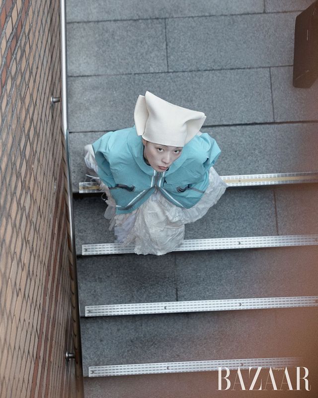 재킷은 1백75만원 Canada Goose. 스커트는 Gyouree Kim. 헤드피스는 Loro Piana.