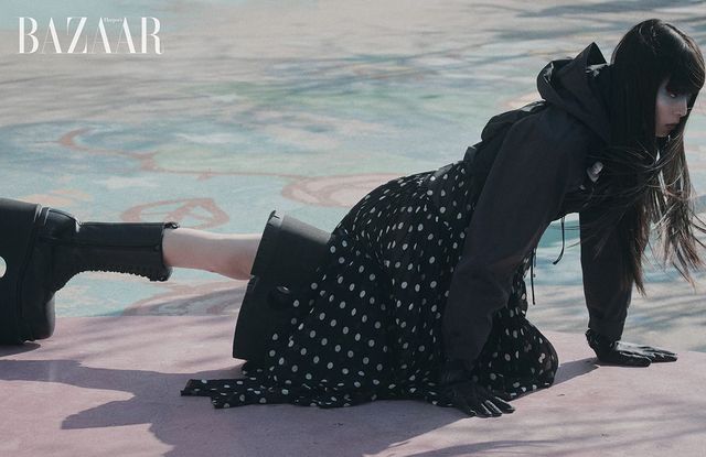러닝 베스트는 16만원대, 재킷은 42만원 Salomon. 도트 드레스는 9백45만원 Moschino. 볼캡, 장갑, 레이스업 플랫폼 부츠는 모두 Balenciaga.