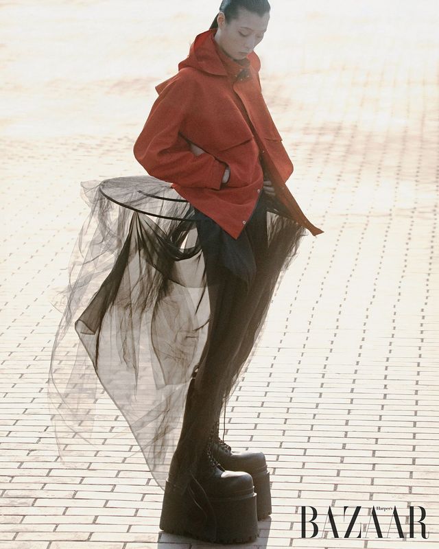 재킷은 Chika Kisada by Adekuver. 파딩게일 스커트는 Gyouree Kim. 레이스업 플랫폼 부츠는 Balenciaga.
