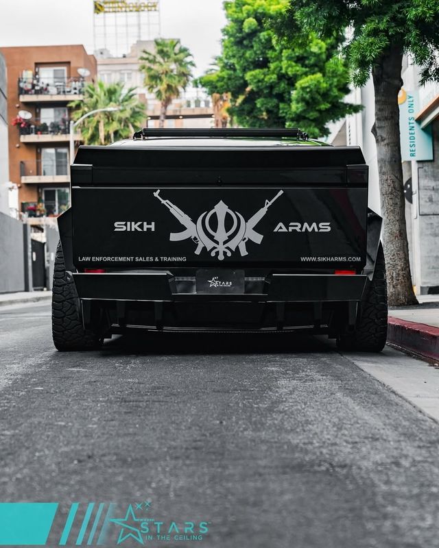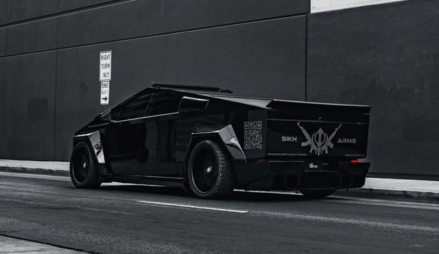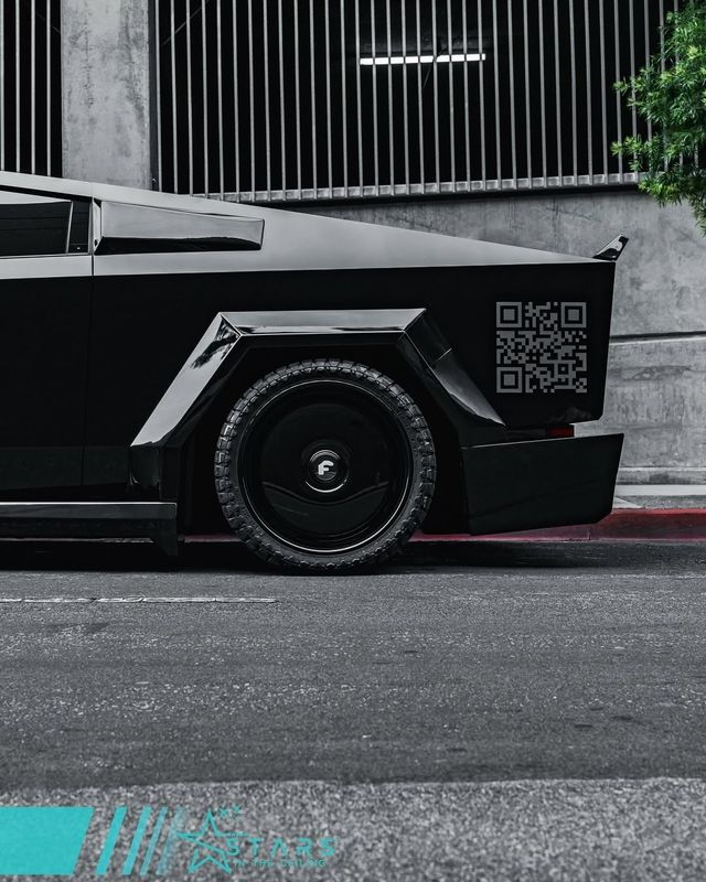 최근 중국과 북미 일부 커뮤니티에서는 외관을 대폭 변경한 사이버트럭 사진이 공개됐다. 차량 전체를 블랙 유광 필름으로 감싼 이 모델은 전면 라이트바 상단에 커스텀 데칼을 부착하고, 후면에는 QR 코드 스티커까지 더했다. 해당 코드는 차량 소유자의 SNS 계정으로 연결된다.