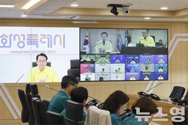 정명근 화성특례시장이 대통령 주재 ‘안전치안 점검회의’에 화상으로 참석해 중앙부처 및 전국 자치단체장들과 함께 재난·치안 대응 방안을 논의하고 있다./사진=화성시