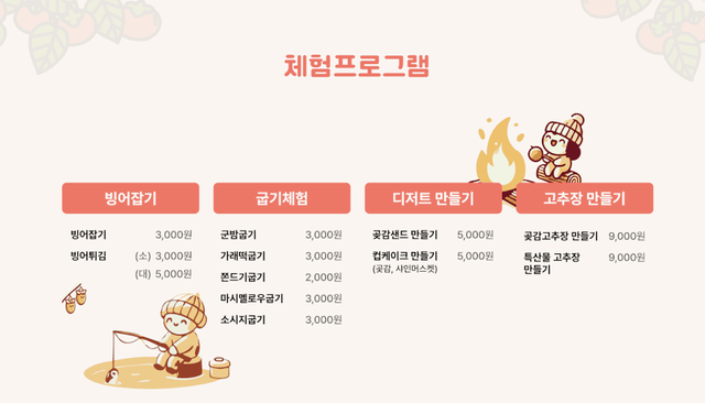 빙어잡기 체험, 수제 곶감 디저트를 만드는 체험까지 흥미로운 프로그램들이 많습니다. 그러나 대부분이 유료이니 현장에서 비용을 확인하거나 사전에 정보를 확인하는 것이 좋습니다.