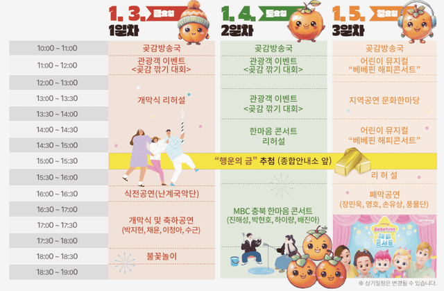 1월 4일에는 MBC충북 한마음콘서트가 열리며, 축제 마지막 날인 1월 5일에는 아이들을 위한 ‘베베핀 해피콘서트’ 어린이 뮤지컬이 준비되어 있습니다. 다양한 공연이 준비되어 있어 모든 연령대가 즐길 수 있는 프로그램들로 채워져 있습니다.