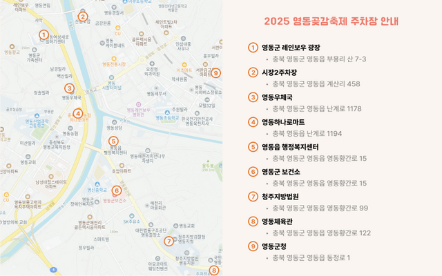 자차를 이용하는 방문객은 영동에 위치한 여러 주차장, 예를 들어 영동군레인보우광장, 영동우체국, 영동읍 행정복지센터 등을 사용하실 수 있습니다.