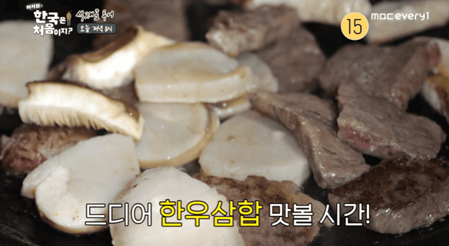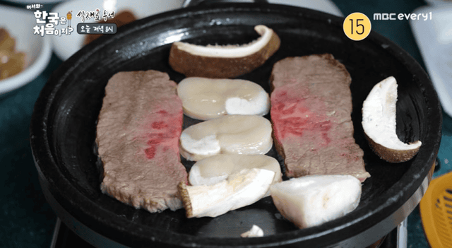 한우는 육즙이 빠져나가기 전에 적당히 구워 부드러운 식감을 유지해야 합니다. 얇은 부위든 두꺼운 부위든 살짝 핏기가 가실 때 뒤집어야 최상의 맛을 즐길 수 있습니다. - 키조개와 표고버섯 굽기