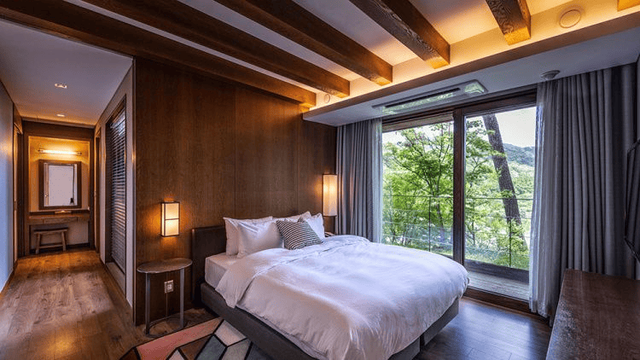 객실은 우드톤 인테리어로 따뜻함을 자아내고, 테라스에서 보이는 마운틴뷰로 일상의 스트레스를 떨칠 수 있습니다. 숲을 바라보며 온몸이 자연에 녹아드는 기분을 만끽해보세요.