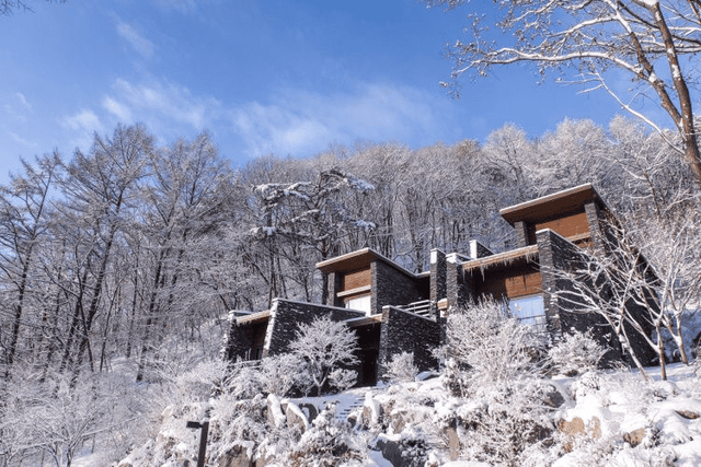 고즈넉한 겨울 분위기를 만끽하고 싶다면, 청풍호반 케이블카 근처의 ‘리솜 포레스트 제천’을 추천합니다. 전 객실이 독채 빌라 형태로 자연을 온전히 느끼며 프라이빗한 시간을 보낼 수 있습니다.