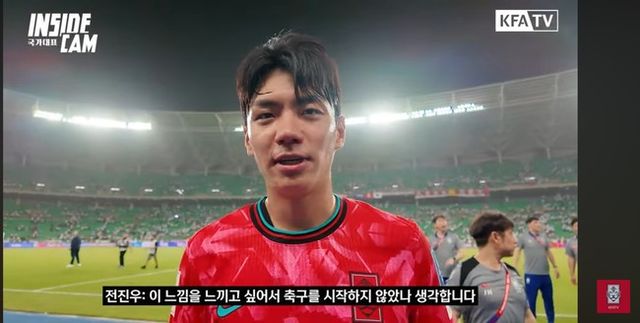 이번 시즌 11골을 터트리면서 K리그1 득점 1위에 올라있다. 완전히 만개한 전진우를 홍명보 감독이 선발했다. 교체 출전해 데뷔전을 치렀고 도움을 올렸는데 월드컵 본선행에 결정적 영향을 끼친 골이었다. 최고의 데뷔전을 치른 전진우 소감을 대한축구협회가 7일 공개한 이라크전 비하인드에서 들을 수 있었다.
