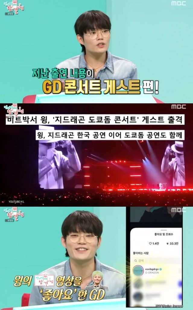 이에 윙은 "주변 반응이 너무 좋았고, 지난 출연 내용이 지드래곤(GD) 콘서트 게스트였다. 그 이후에 지드래곤 일본 콘서트까지 같이 갔다"고 밝혔다.